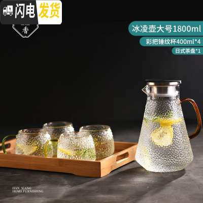 三维工匠凉水壶玻璃可高温烧水壶家用大容量冷水壶加厚防爆凉水杯水 冰凌壶1800+彩把锤纹(冰晶)杯*4+日式茶盘*1