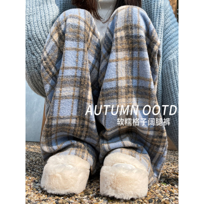 蓝色毛呢格子裤女春秋季新款宽松慵懒休闲薄款直筒显瘦阔腿裤