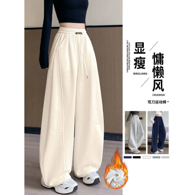 加绒镰刀运动裤子女款新款白色加厚卫裤胖mm宽松阔腿长裤