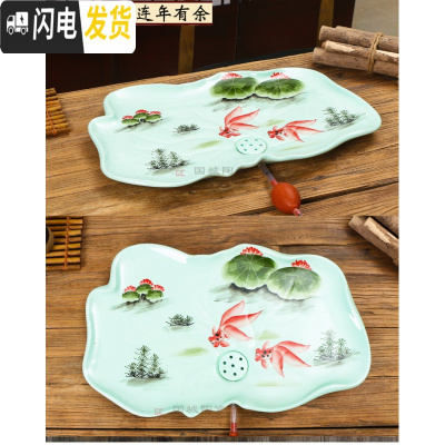 三维工匠瓷手绘荷花功夫茶盘小排水式大号工夫茶家用单独单陶瓷大托盘 21英寸连年有余茶具