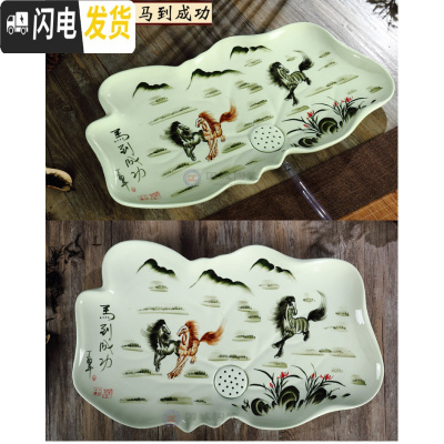 三维工匠瓷手绘荷花功夫茶盘小排水式大号工夫茶家用单独单陶瓷大托盘 19英寸马到成功茶具