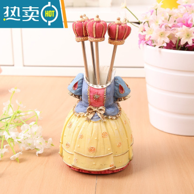 敬平欧式水果叉不绣钢水果叉子韩国家用儿童创意可爱水果叉套装甜品叉 宫廷礼服黄色(五个叉子)牙签