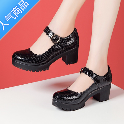 SUNTEK春季新款百搭单鞋圆头高跟鞋粗跟漆皮防水台演出浅口性感婚鞋10M