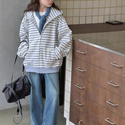 女童外套春秋款新款时尚大童女孩韩系宽松洋气条纹连帽上衣潮