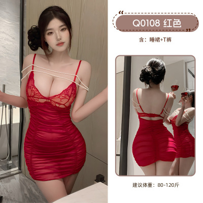 九里晴川吊带珍珠挂肩网纱透视装魅力性感情趣睡衣免脱纯欲网纱裙