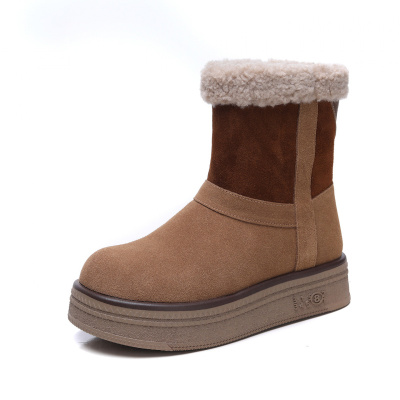 保暖羊羔毛雪地靴女冬季新款拼色真皮短靴加绒防滑厚底百搭