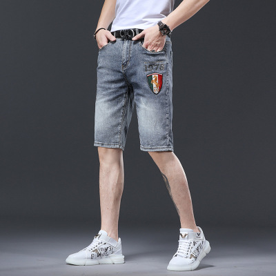 潮牌五分牛仔裤子男夏季新款烫钻刺绣休闲弹力直简品牌牛仔短裤男