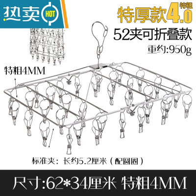敬平方形特厚晾袜子衣架多夹子不锈钢防风袜夹晾衣夹挂钩婴儿凉晒衣架 [特厚折叠款]特粗防风[52夹] [特粗4.