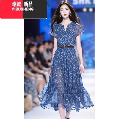 YIBUSHENG茶歇法式看端庄大气温柔风别致绝美显瘦蓝色雪纺连衣裙子女