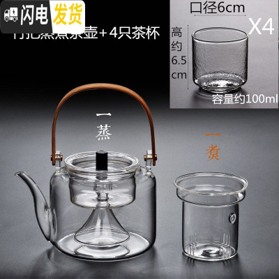 三维工匠家用竹把提梁壶蒸煮茶壶玻璃壶泡茶壶执壶过滤煮茶器烧水壶养生壶 竹把蒸煮茶壶+四只锤纹直觉茶杯