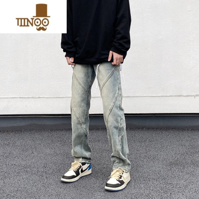 YANXU非潮勿近高街美式复古做旧水拼接牛仔裤男宽松直筒hiphop垂感裤子