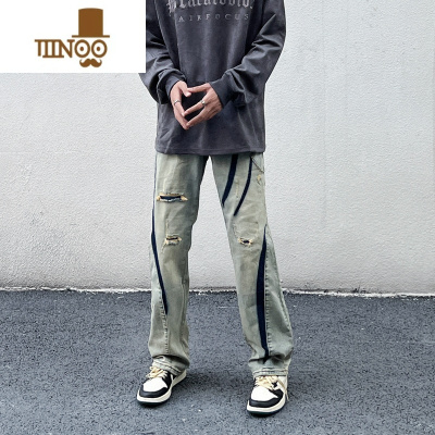 YANXU非潮勿近高街美式复古水洗黄泥破洞牛仔裤男宽松直筒嘻哈潮牌裤子