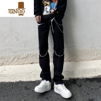 YANXU非潮勿近高街美式复古破洞牛仔裤男宽松直筒hiphop设计感潮牌裤子