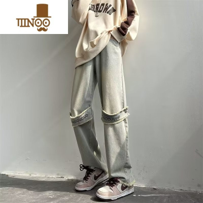 YANXU美式高街做旧牛仔裤男设计感毛边贴布直筒裤ins潮牌复古阔腿裤子