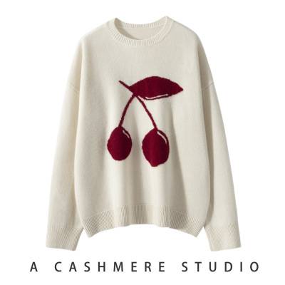 山羊绒衫女士大樱桃提花圆领宽松长袖加厚羊绒针织打底衫毛衣外穿