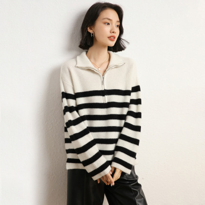 山羊绒衫女条纹毛衣女士法式复古翻领半拉链秋季慵懒风针织打底衫