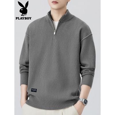 花花公子半拉炼毛衣男士立领线衣秋季新款宽松休闲打底针织衫男装
