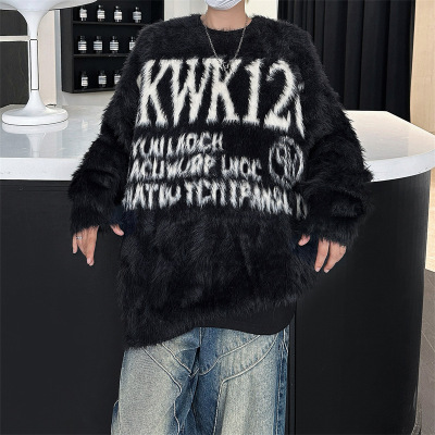 男装仿水貂绒毛衣男女同款美式潮牌ins字母提花宽松针织衫男