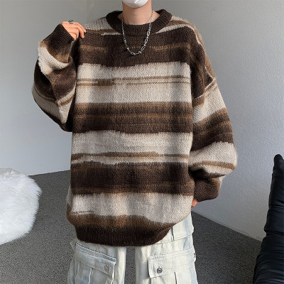 男装新款圆领毛衣男休闲撞色条纹针织衫宽松慵懒风穿搭情侣打底衫