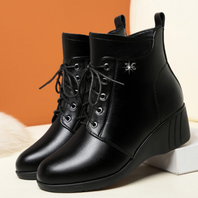 秋冬妈妈棉鞋新款坡跟防滑厚底女靴子加绒保暖短靴中老年