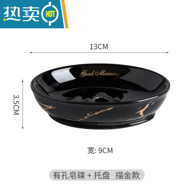 敬平北欧卫生间陶瓷肥皂盒沥水香皂碟轻奢风家用酒店香皂盒韩国小皂盒 黑色描金有沥水孔皂碟 +沥水托盘