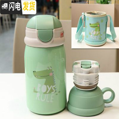 三维工匠双盖两用带布套小孩保温水壶便携户外儿童保温杯带吸管宝宝喝水杯 绿色双盖送布套350