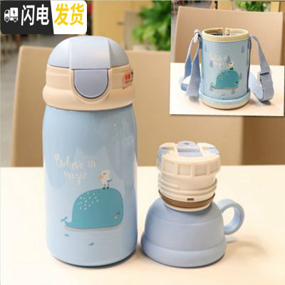 三维工匠双盖两用带布套小孩保温水壶便携户外儿童保温杯带吸管宝宝喝水杯 蓝色双盖送布套350