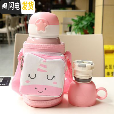 三维工匠双盖两用带布套小孩保温水壶便携户外儿童保温杯带吸管宝宝喝水杯 独角兽500双盖送布套