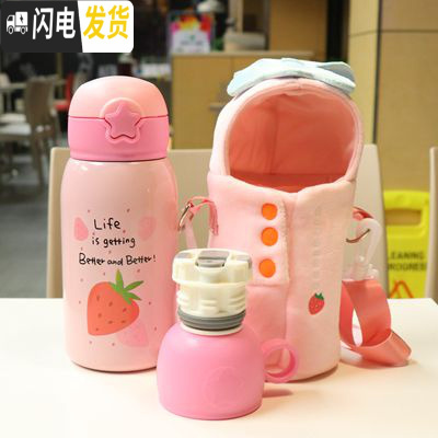 三维工匠双盖两用带布套小孩保温水壶便携户外儿童保温杯带吸管宝宝喝水杯 草莓500双盖送布套