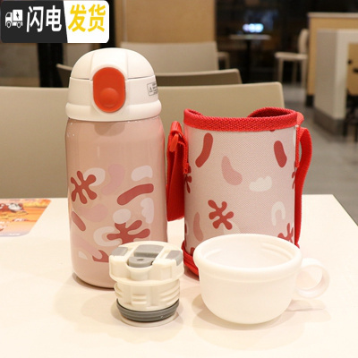 三维工匠双盖两用带布套小孩保温水壶便携户外儿童保温杯带吸管宝宝喝水杯 粉色360双盖送布套542