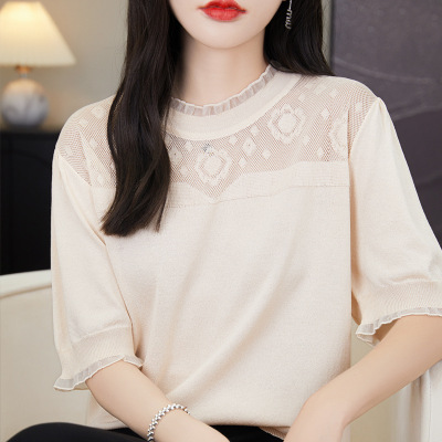 夏季丝光羊毛薄款镂空短袖荷叶领纯色宽松拼接套头洋气百搭上衣