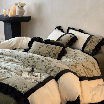 高端中古风刺绣牛奶绒四件套精致荷叶边绒被套加厚元旦乔迁床品