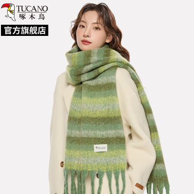 啄木鸟2024冬新款绿色条纹围巾女冬季保暖长款加厚高级感条纹围脖
