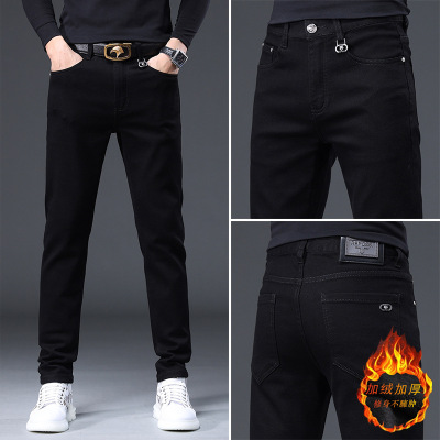 欧货高端黑色牛仔裤男秋冬季加绒潮牌修身简约弹力小脚休闲长裤男