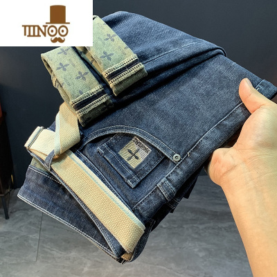 YANXU牛仔裤男2023新款秋季修身小直筒刺绣印花韩版潮流弹力透气长裤子