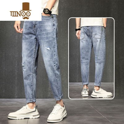 YANXU破洞牛仔裤男夏季薄款宽松直筒款复古修身小脚九分长裤子男士