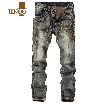 YANXU欧美复古牛仔裤男拼接乞丐做旧补丁修身型直筒长裤子个性潮牌机车
