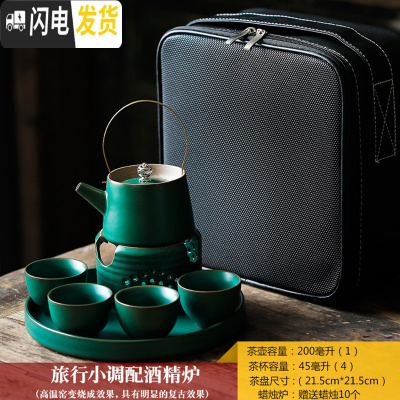 三维工匠日式茶具套装家用一壶四杯便携旅行功夫茶具陶瓷茶盘小套简约 仿古绿釉-旅行小调-铜提梁+蜡烛炉
