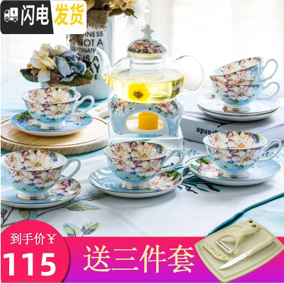 三维工匠花茶壶水果茶壶花茶杯套装家用英式下午茶茶具欧式玻璃壶耐热蜡烛 蓝色馨蕊(2杯+2碟+1壶+1温茶器)