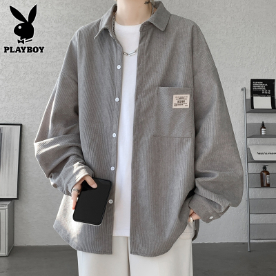 花花公子浅灰长袖衬衫男士春秋款灯芯绒衬衣服潮牌秋季宽松外套男