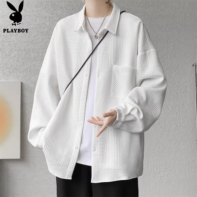 花花公子白色长袖衬衫男士潮牌春秋季青少年上衣华夫格衬衣外套男