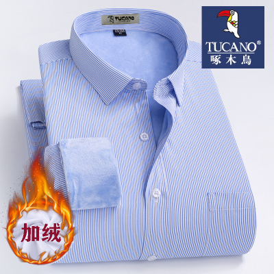 啄木鸟冬季加大码保暖男衬衫加绒加厚商务正装抗皱长袖棉条纹衬衣