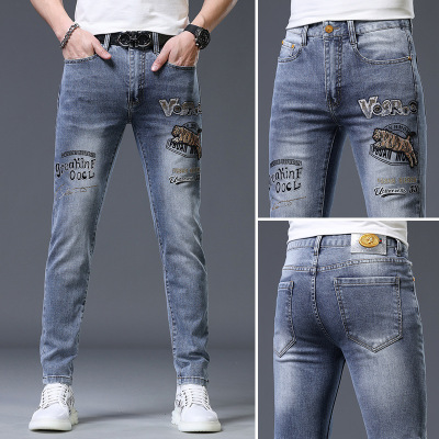 欧货潮牌牛仔裤男士夏季新款高端刺绣弹力修身小脚休闲长裤子