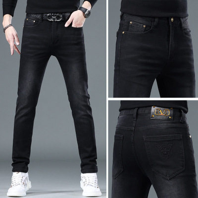 秋季黑色高端牛仔裤男士秋冬季新款弹力修身小直筒加厚长裤子