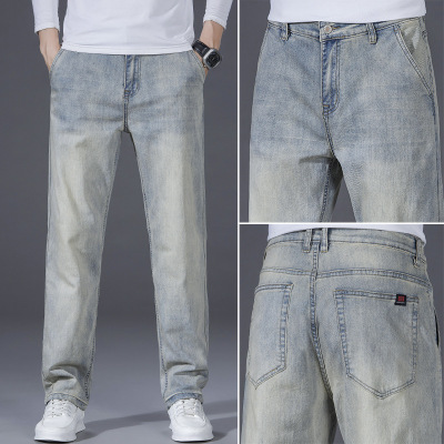 复古男士做旧弹力牛仔裤男青年春季常规泥色宽松直筒阔腿裤