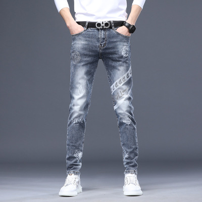 轻奢牛仔裤男士夏季薄款欧货浅色时尚印花修身小脚弹力休闲长裤子