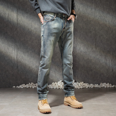 秋季新款男士牛仔裤潮牌美式复古修身直筒锥形弹力休闲长裤子