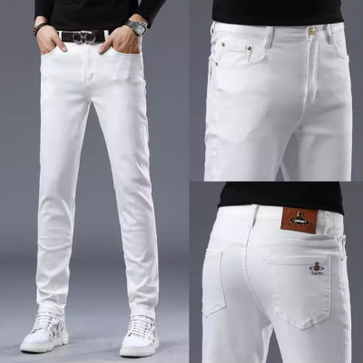 春夏高端欧货白色牛仔裤男士修身小直筒休闲弹力纯棉男长裤