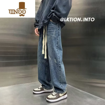 YANXU抽绳牛仔裤男士宽松直筒阔腿高街复古潮牌美式夏季新款百搭长裤子