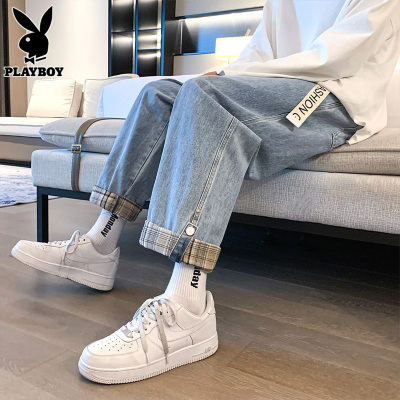 花花公子夏季牛仔裤男士宽松直筒阔腿卷边新款潮牌帅气长裤子男裤